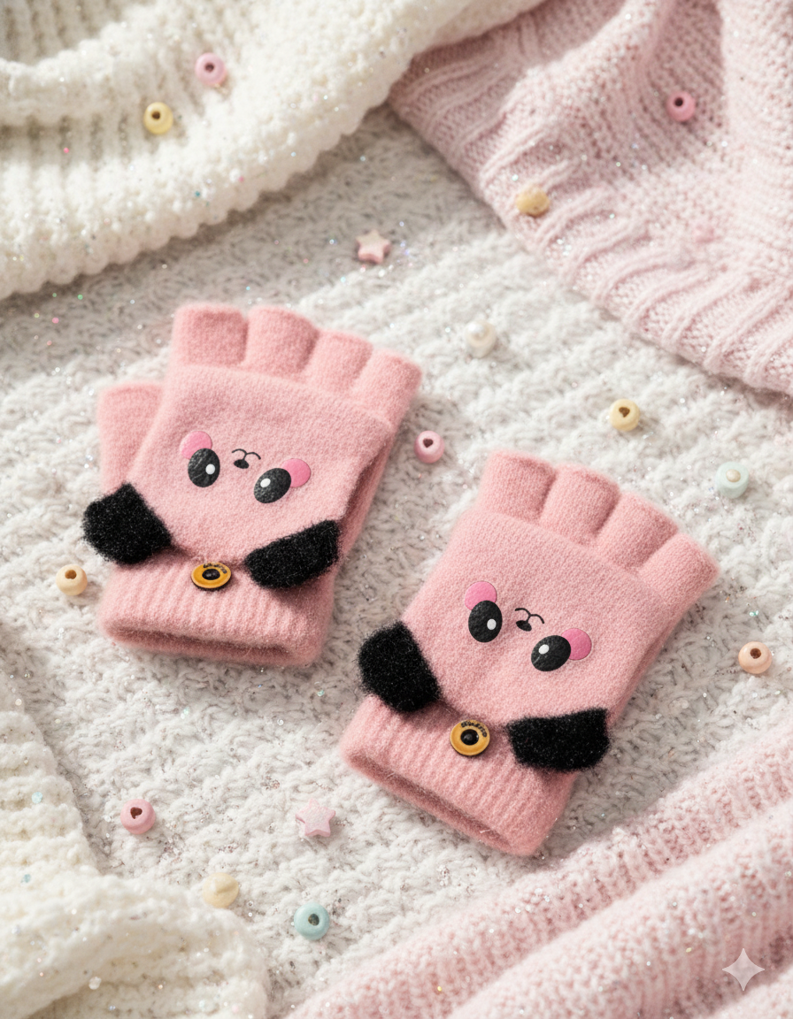 Cute Winter Fingerless Gloves, Pink Knit Half Gloves with Kawaii Animal Face Design, Warm Winter Accessories.