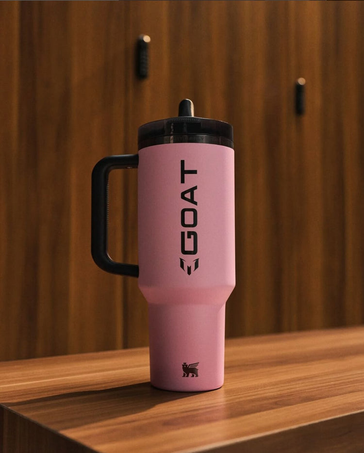 Stay refreshed all day with the GOAT Stainless Steel Tumbler. Featuring a stylish pink finish, extra-large capacity, and a leakproof lid with straw, this double wall insulated mug keeps drinks cold for up to 12 hours. The ergonomic handle makes it easy to carry from gym to office, while its wide mouth design ensures hassle-free cleaning and refilling. Durable, sleek, and designed for those who demand the best in hydration.
