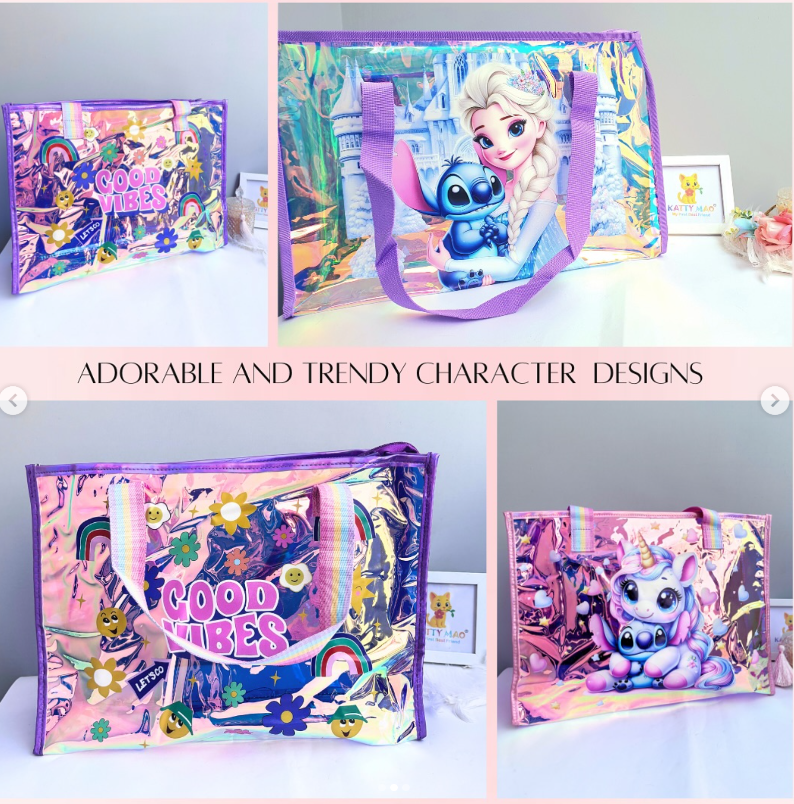 Featuring shimmery iridescent material, super-cute cartoon and unicorn prints, and roomy zipped compartments, this lightweight duffle bag makes school, travel, or playdates more fun. Durable, easy to carry, and available in multiple designs like "Good Vibes", charming animals, and dreamy unicorns – perfect for girls who love a little extra sparkle!